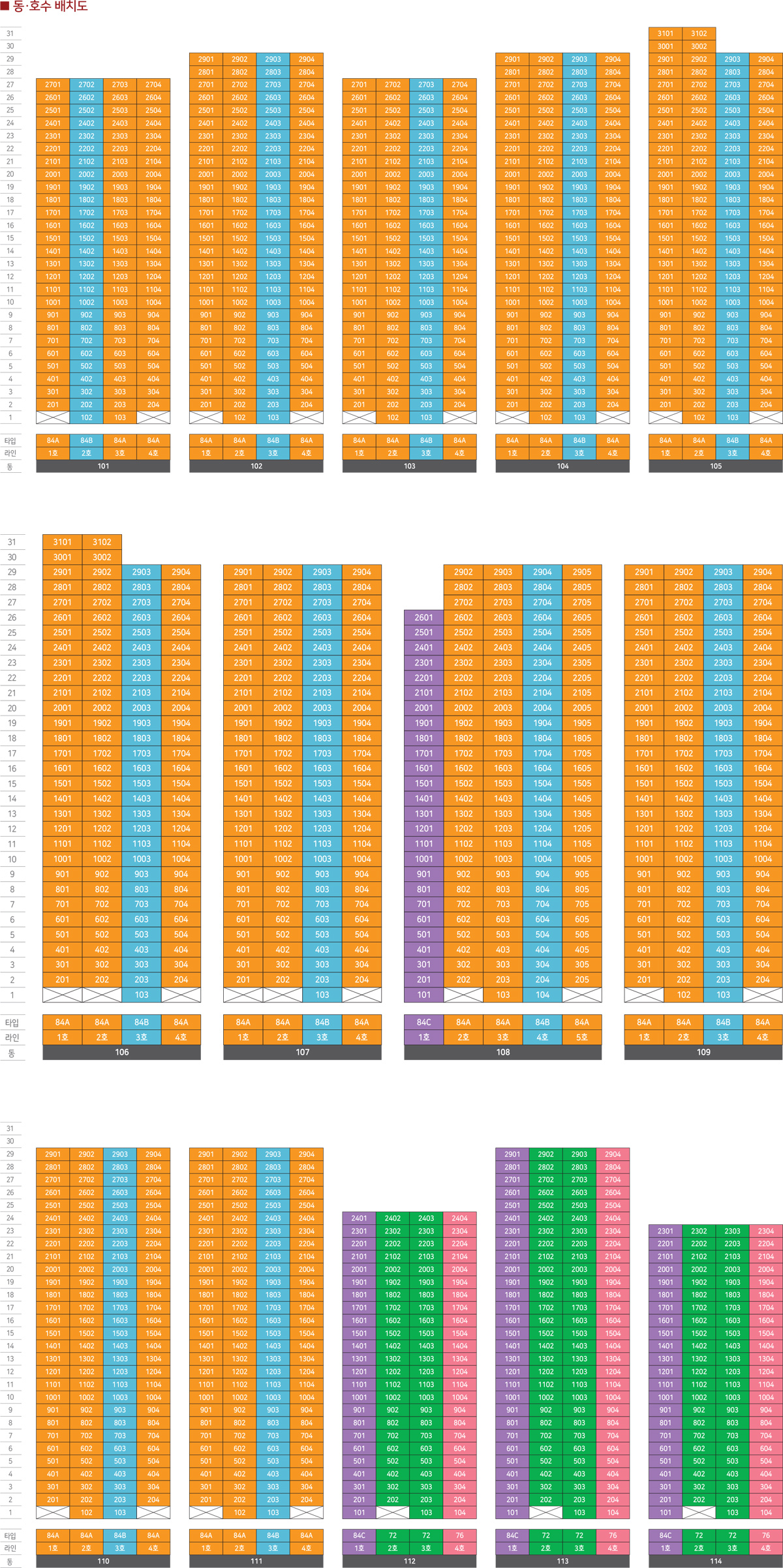 - ※ 상기 동·호수 표기는 편집 과정상 오류가 있을 수 있으니 자세한 내용은 반드시 견본주택으로 문의 또는 방문하여 확인해주시기 바랍니다.